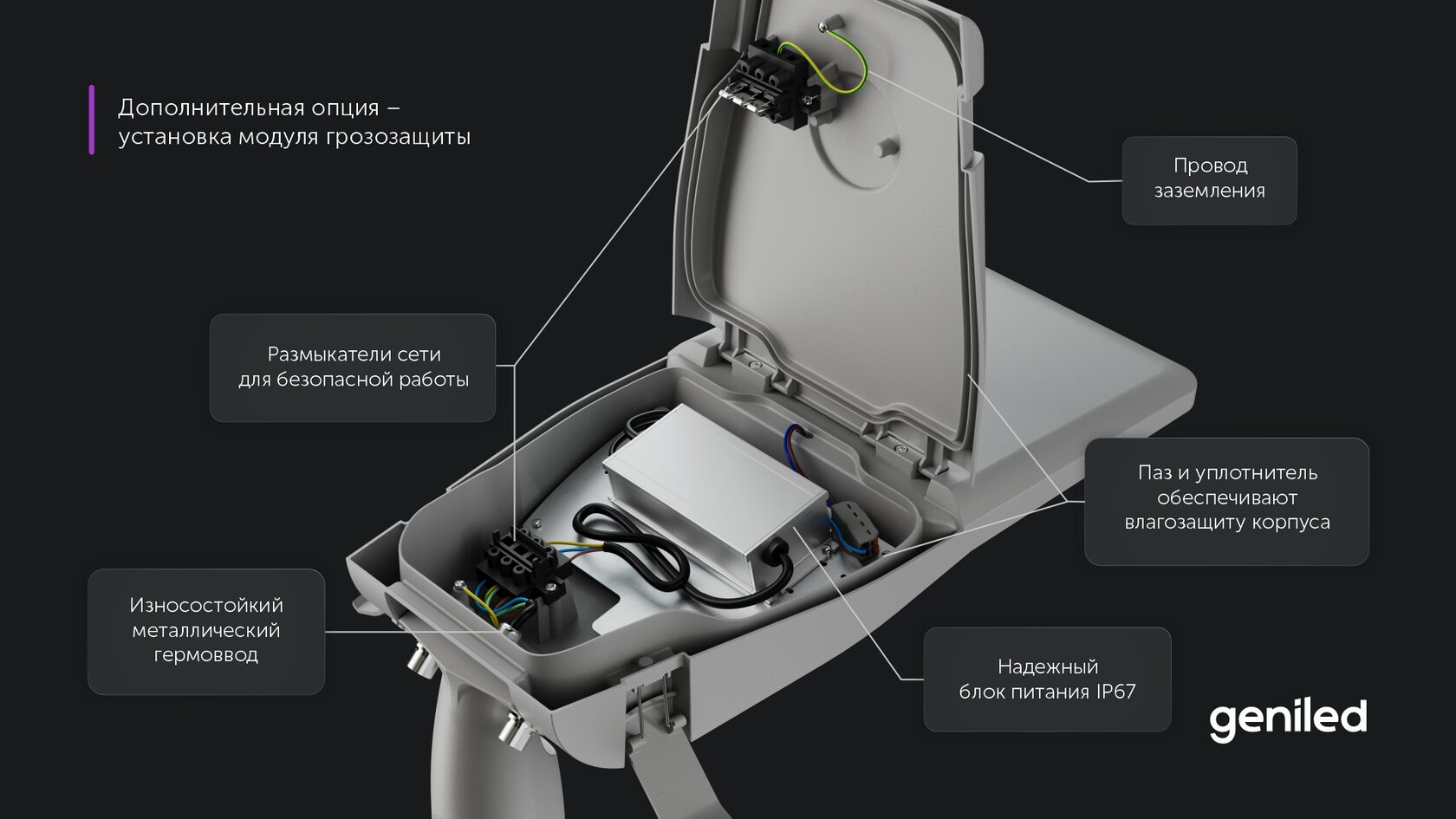 Дополнительные опции ▫️ Установка разъема NEMA Socket 7PIN (без крышки). Стандартизированное решение для быстрого подключения к автоматизированным системам управления наружным освещением. ▫️ Покраска корпуса в любой цвет по шкале RAL (базовый цвет светильника — серый).