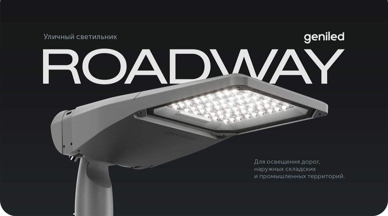 | Новинка! Светильник Roadway | | | | Надежное и энергоэффективное решение для освещения автомобильных дорог, а также наружных складских и промышленных территорий. | | | | Конструктив и монтаж • Поворотный узел позволяет монтировать светильник как на консольную, так и на торшерную опору (Ø 45–60 мм) с удобной регулировкой угла наклона. • Bстроенные размыкатели сети для безопасного обслуживания, провод заземления и износостойкий металлический гермоввод. • Надежный блок питания IP67, а также специальный паз с уплотнителем для полной герметичности корпуса.